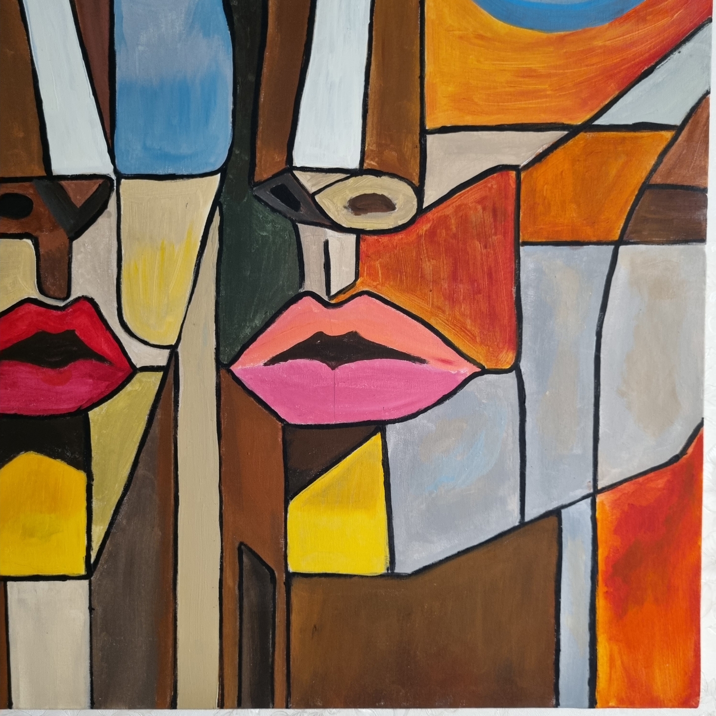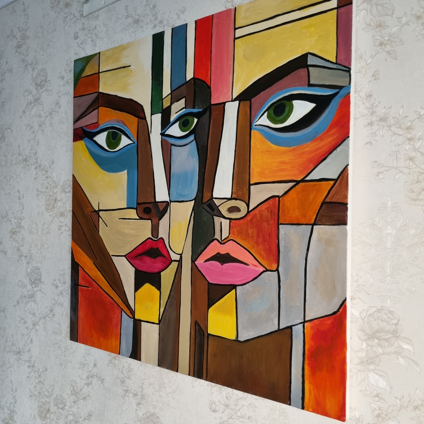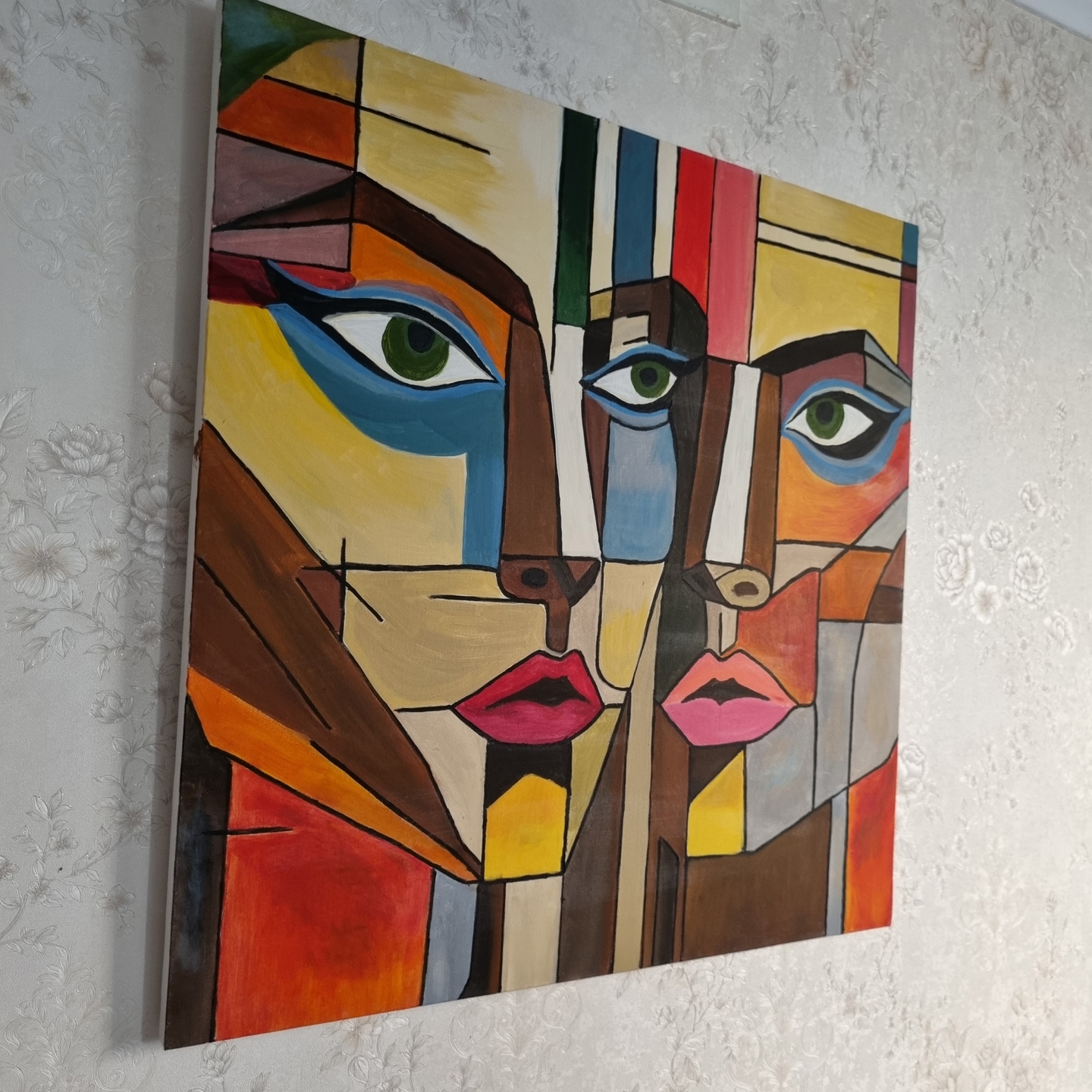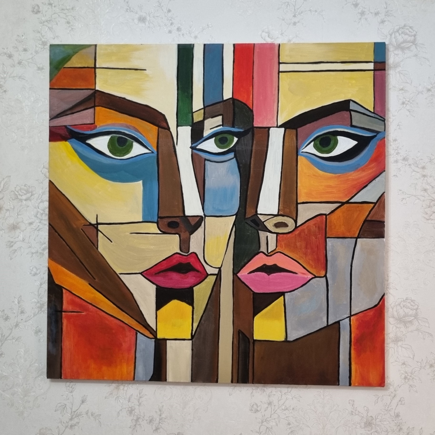 این تابلو نقاشی اکریلیک به نام دو صورت به سبک آبستره کشیده شده .این  تابلو در ابعاد 80 در 80 سانتیمتر و عمق معمولی موجود است و همچنین تک نسخه  ای است .بوم این تابلو و مواد به کار رفته با کیفیت است و با بسته بندی  مناسبی ارسال می گردد .خالق این اثر هنرمند علیرضا سالمیان است.در پایان  کار برای جلوه بیشتر و دوام تابلو و قابلیت تمیز کردن از وارنیش مات  استفاده شده