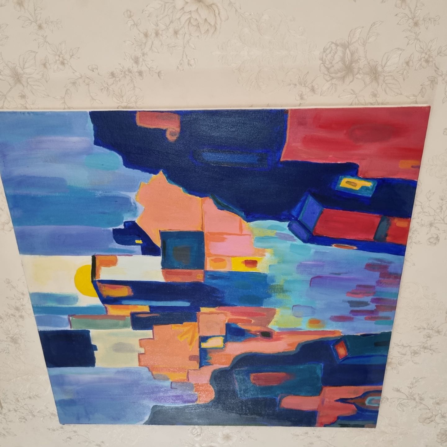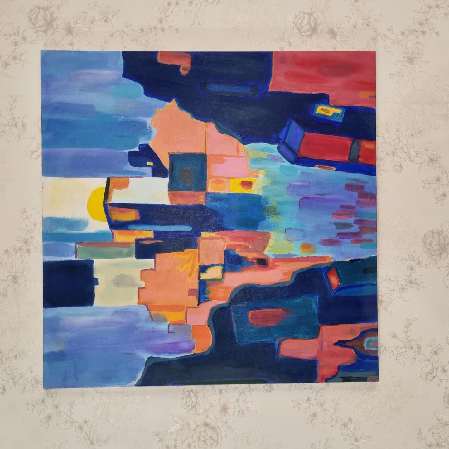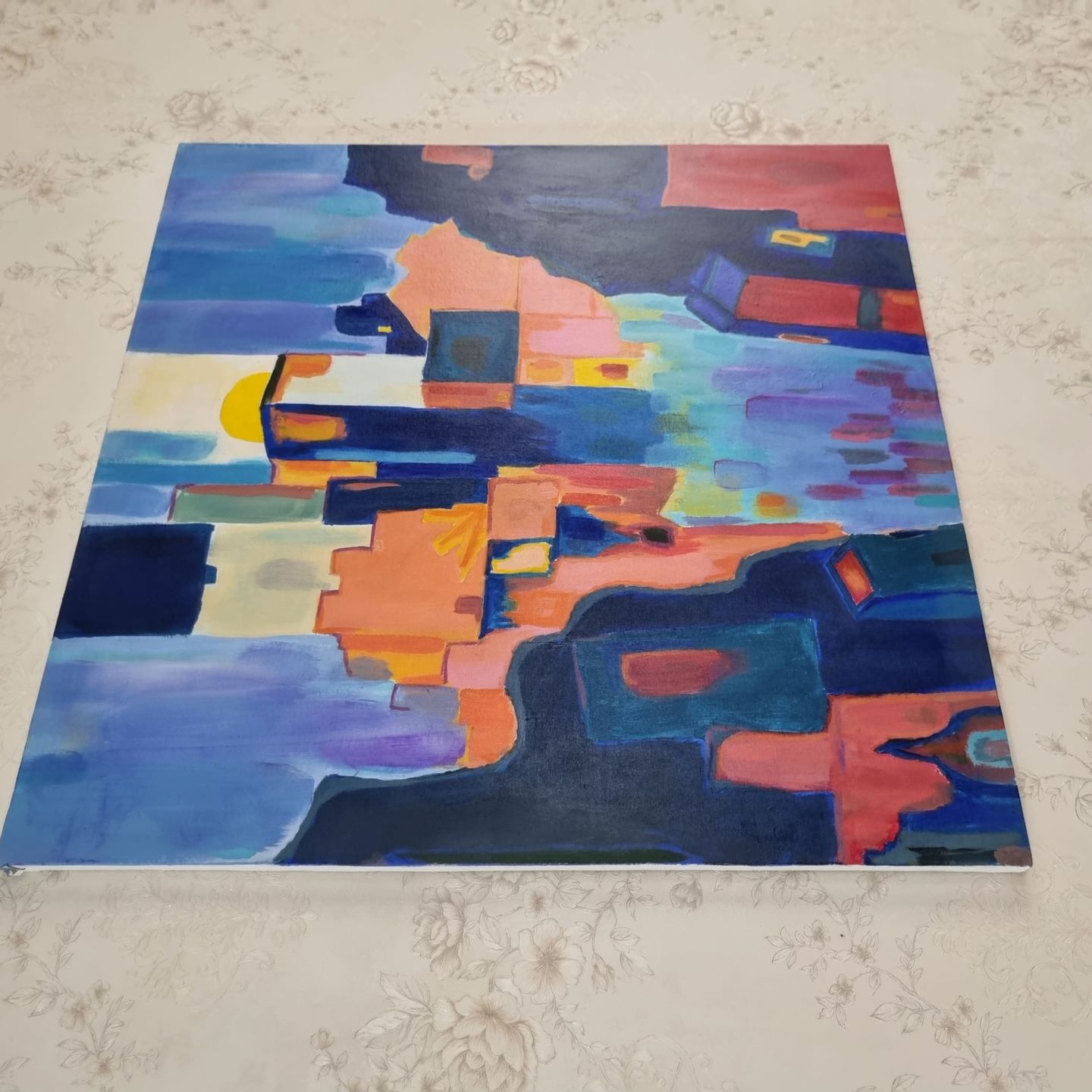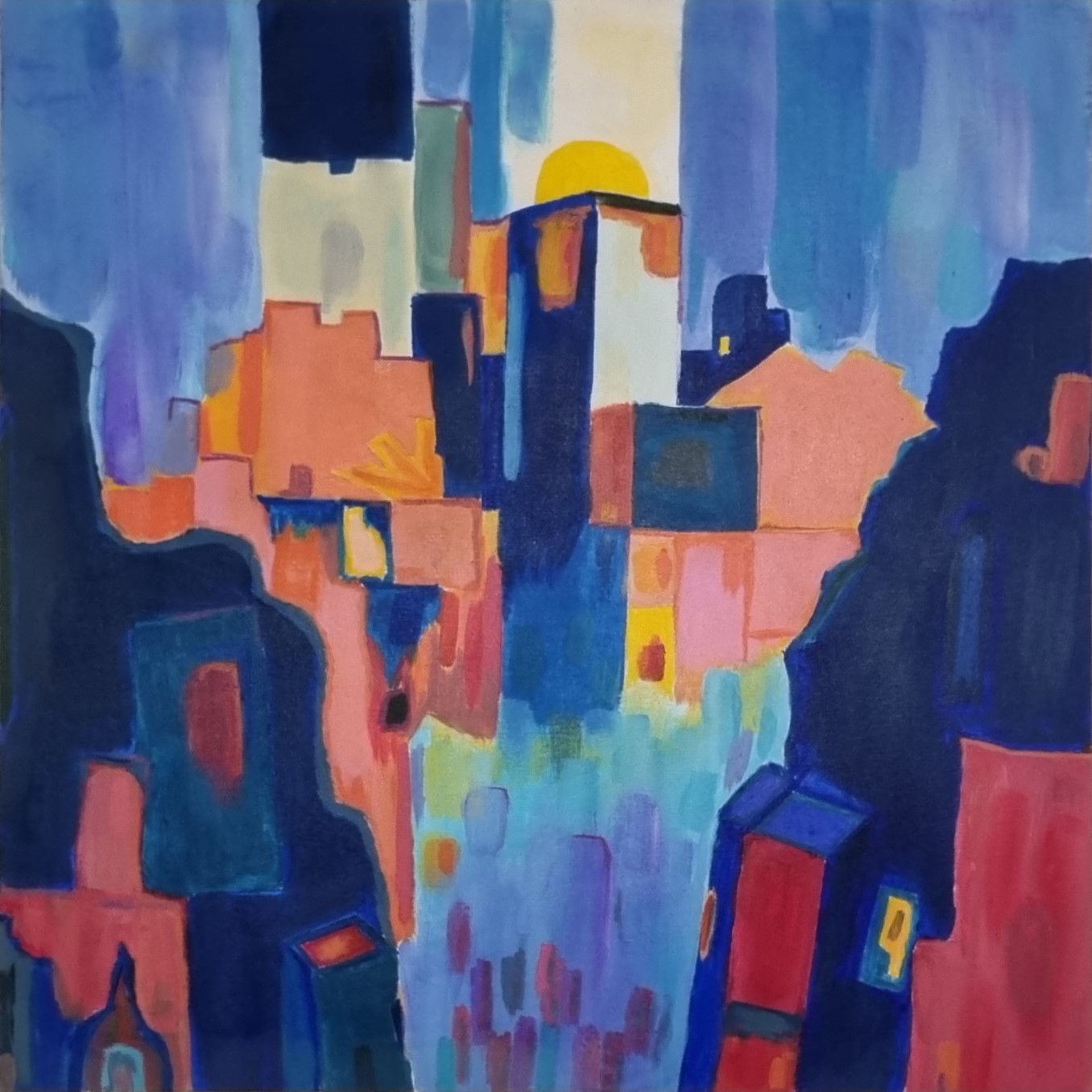 این تابلو نقاشی اکریلیک به نام شهر پشت صخره به سبک آبستره کشیده شده .این تابلو در ابعاد 80 در 80 سانتیمتر و عمق معمولی موجود است و همچنین تک نسخه ای است .بوم این تابلو و مواد به کار رفته با کیفیت است و با بسته بندی مناسبی ارسال می گردد .خالق این اثر هنرمند علیرضا سالمیان است.در پایان کار برای جلوه بیشتر و دوام تابلو و قابلیت تمیز کردن از وارنیش براق استفاده شده
