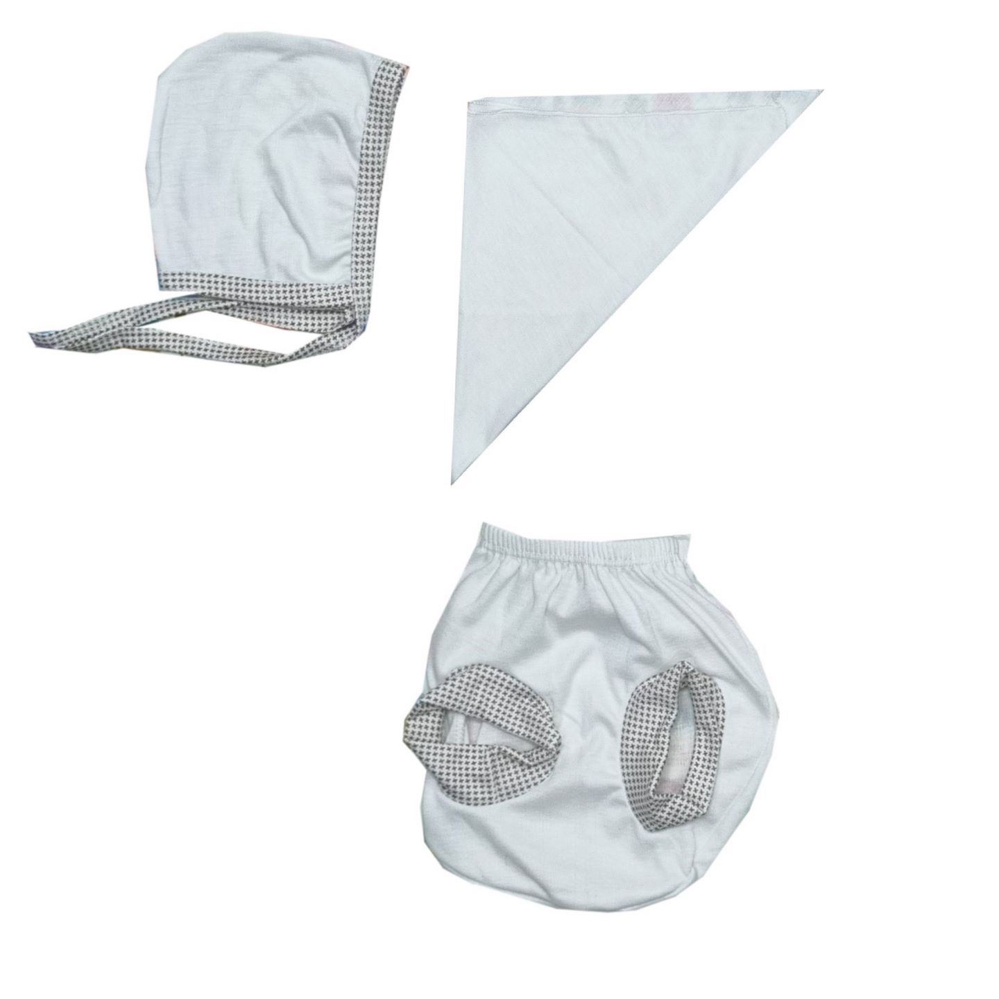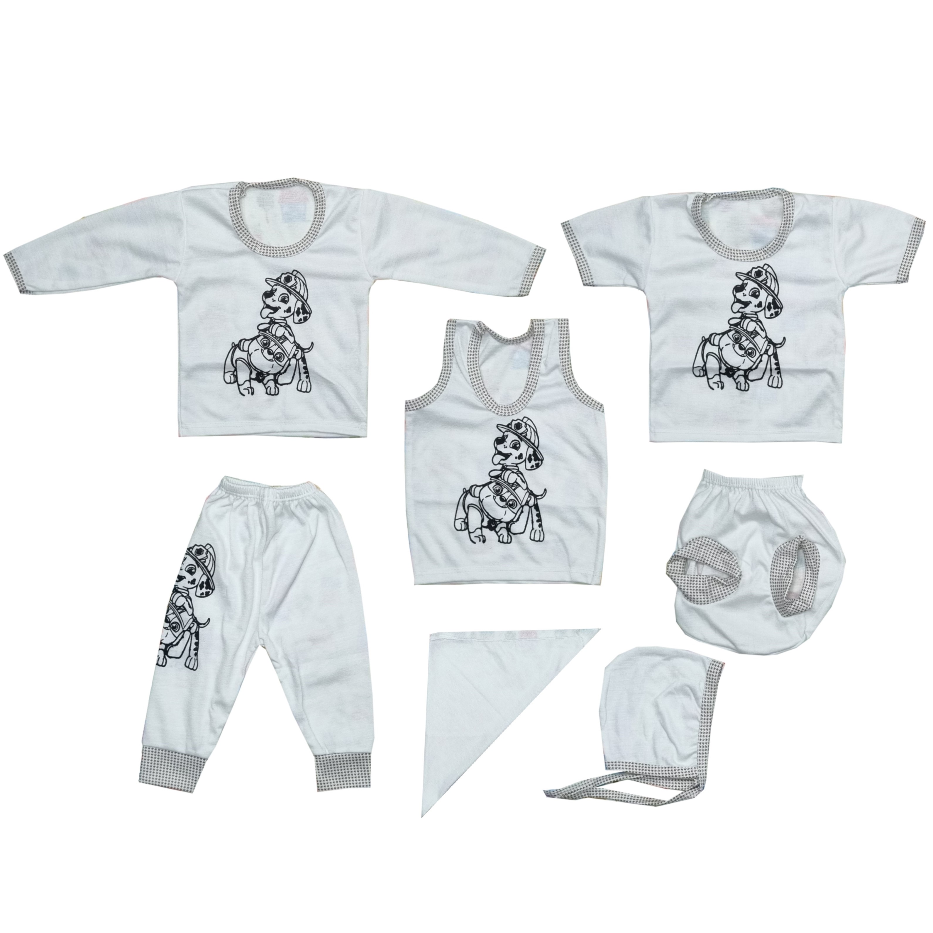 این محصول ست 7 تکه برند مهرسام شامل بلوز آستین بلند و کوتاه و رکابی و شلوار و شورت عینکی و روسری و کلاه است. این ست از جنس نخی می باشد که مانع تعریق و حساسیت می گردد. کالا در طرح سگهای نگهبان و سایز 00 مخصوص سیسمونی موجود است. جدول سایزبندی به خرید شما کمک می کند.شما می توانید با کلیک بر روی لینک (( پوشاک نوزادی )) مدلهای دیگر و لینک (( ست هفت تکه سیسمونی )) رنگهای دیگر و تنوع های مختلف این محصول را مشاهده کنید.