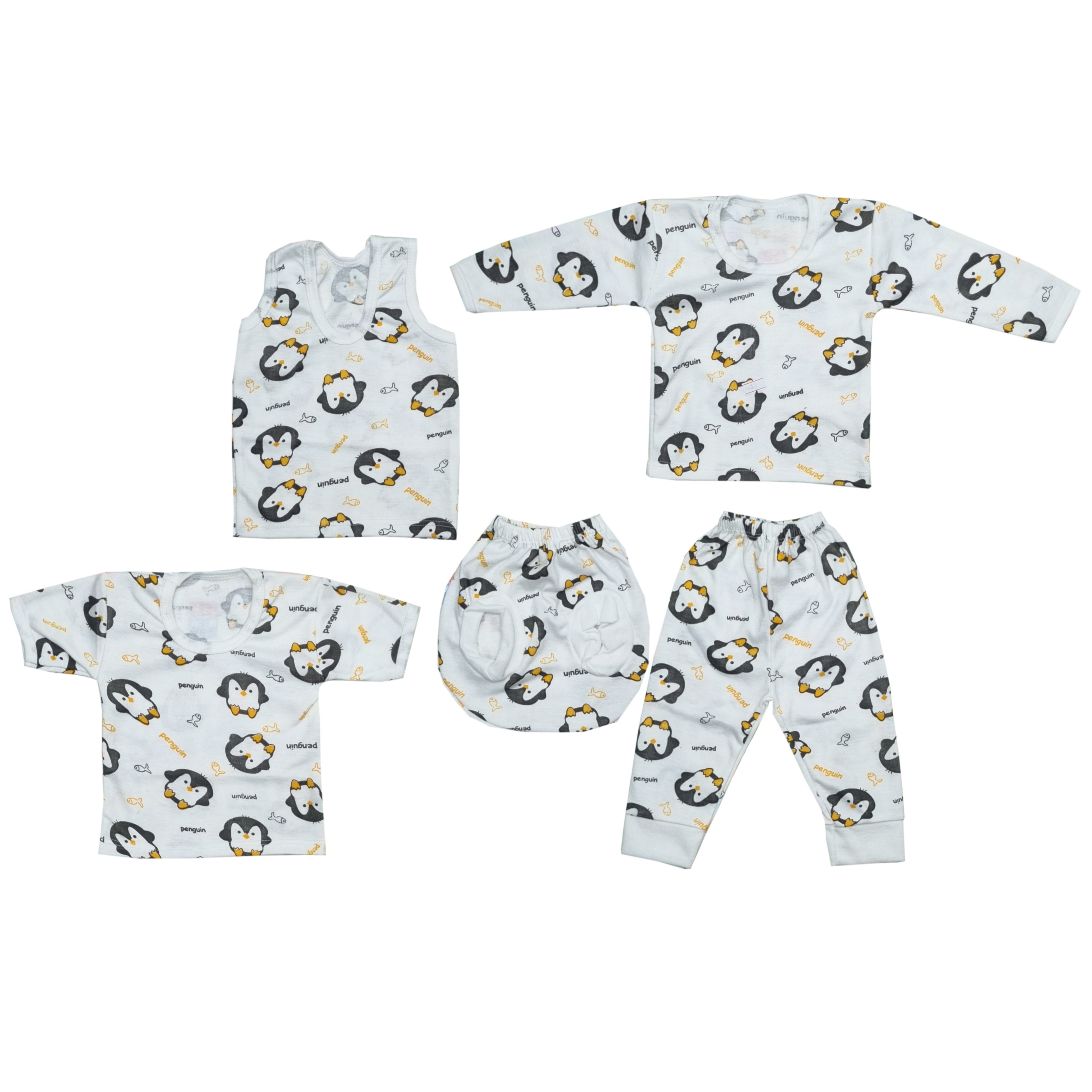 این محصول ست 5 تکه برند مهرسام شامل بلوز آستین بلند و کوتاه و رکابی و شلوار و شورت عینکی است. این ست از جنس نخی می باشد که مانع تعریق و حساسیت می گردد. کالا طرح پنگوئن و در 3 سایز : 1 مناسب 0 تا 3 ماهگی/ 2 مناسب 3 تا 5 ماهگی / 3 مناسب 5 تا 10 ماهگی موجود است. جدول سایزبندی به خرید شما کمک می کند.شما می توانید با کلیک بر روی لینک (( ست لباس نوزاد )) مدلهای دیگر و لینک (( ست پنج تکه نوزادی )) رنگهای دیگر و تنوع های مختلف این محصول را مشاهده کنید.